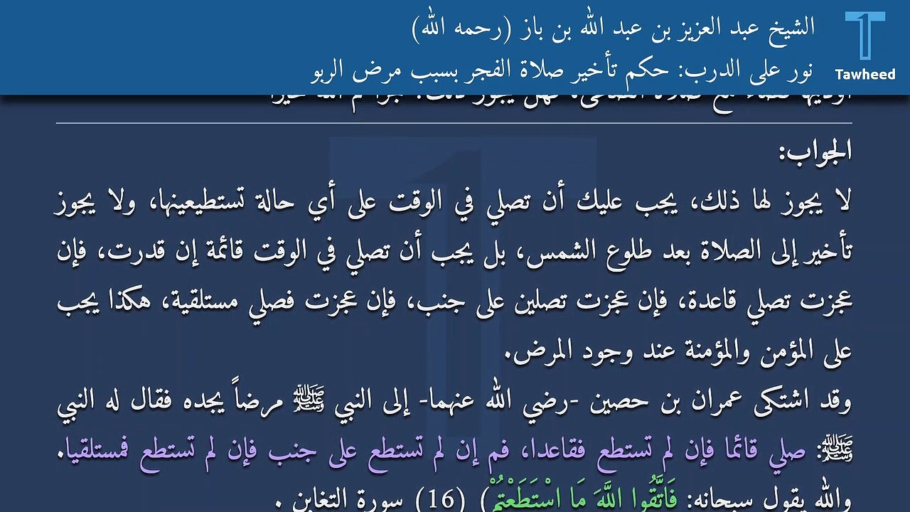 نور على الدرب حكم تأخير صلاة الفجر بسبب مرض الربو الشيخ عبد العزيز بن عبد الله بن باز رحمه الله video dailymotion